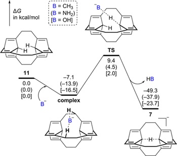 圖4. 由烴類前體11轉化為碳負離子7的勢能面。