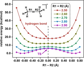 最近,余志祥教授和研究助理王熠博士通過理論計算首次提出了對稱C···H···C氫鍵存在的可能性。作者首先以甲烷與甲基負離子所形成的氫鍵復合物為例論證了對稱C···H···C氫鍵存在的理論基礎。如圖2所示,當兩個碳原子之間的距離被固定為2.90 ?時,體系展現出了雙勢阱勢能面的特征。隨著兩個碳原子不斷靠近,勢能面逐漸由雙勢阱向單勢阱過渡。最終,當兩個碳原子之間的距離被縮短至2.50 ?時,體系中首次出現了對稱的碳氫碳氫鍵。