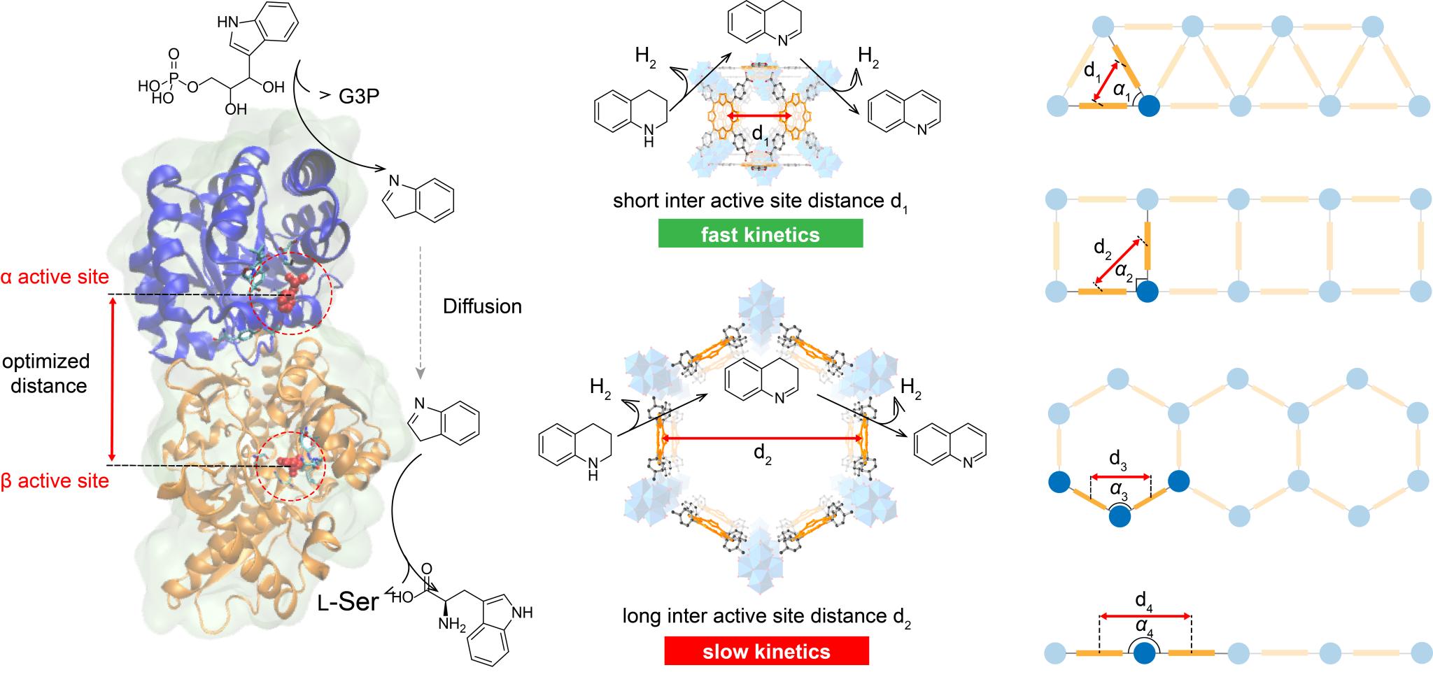 在化學(xué)反應(yīng)中,催化活性位點(diǎn)的空間分布對(duì)于催化劑整體的活性有重要影響。無(wú)機(jī)催化劑的設(shè)計(jì)合成通常會(huì)圍繞材料的形貌、顆粒的大小、孔隙率、比表面積、孔的幾何特征、活性位點(diǎn)的密度等方面討論其對(duì)于催化反應(yīng)活性的影響,這些影響因素都至關(guān)重要,但也較為紛繁復(fù)雜,成為催化劑結(jié)構(gòu)設(shè)計(jì)的壁壘。此項(xiàng)研究嘗試將紛繁的影響因素歸一到距離這一基本物理指標(biāo)上,研究活性位點(diǎn)之間的距離對(duì)催化性能的影響。研究者利用金屬有機(jī)框架(metal-organic framework,簡(jiǎn)稱MOF)的結(jié)構(gòu)高度有序和組分結(jié)構(gòu)精確可調(diào)的特性,以基于相同活性有機(jī)配體構(gòu)筑的六種不同的MOF為對(duì)象,在涉及多步反應(yīng)的光催化體系中,系統(tǒng)的探究了活性中心在MOF晶態(tài)結(jié)構(gòu)中的微觀距離對(duì)其宏觀催化性能的影響。揭示了光催化反應(yīng)活性(turnover frequency, TOF)隨活性中心之間的距離(inter active site distance)減小而增加的規(guī)律,并建立合理的公式定量描述其具體關(guān)系。通過(guò)在某些特定的晶體結(jié)構(gòu)的位點(diǎn)上的制造缺位的方法,研究者進(jìn)一步設(shè)計(jì)合成了一系列的Jenga MOF,發(fā)現(xiàn)了使其催化活性超越“距離—性能”線性關(guān)系的方法。這些探索和發(fā)現(xiàn)為無(wú)機(jī)催化劑的設(shè)計(jì)合成提供了更為豐富的選擇。