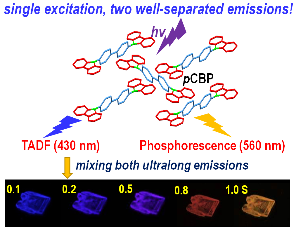 圖1: 長余輝顏色隨時間變化圖和QM(CASPT2)/MM計算得到的pCBP和mCBP晶體的發光機理示意圖。