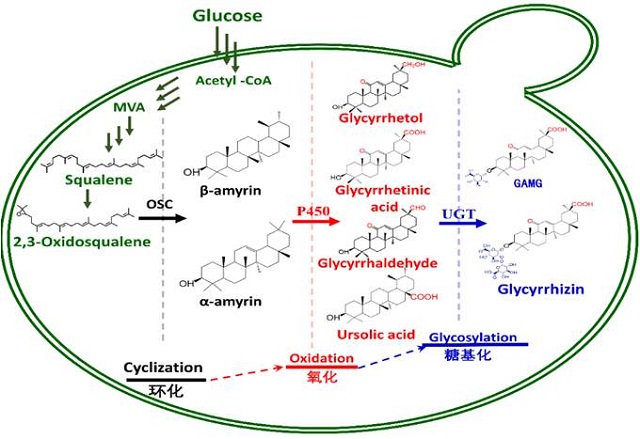 中藥方劑中的十方九草中的“草”指的就是傳統中藥甘草,又稱國老,具有清熱解毒之功效又用以調和諸藥。其中,甘草三萜是甘草的主要活性成分,如甘草酸及其衍生物等具有抗病毒、抗腫瘤、抗炎癥等多種生理活性同時又不抑制人體免疫系統,是肝臟炎癥治療中的抗炎癥藥物代表。當前,在湖北抗擊新冠肺炎治療中使用的甘草酸二胺組合維生素C發揮了積極作用。李春教授課題組前期開創性地利用微生物合成植物甘草中主要三萜類化合物的系列研究(單葡萄醛酸基甘草次酸Chem Eng Sci 2014;β-香樹脂醇AIChE Journal 2015;角鯊烯Chem Eng Sci 2016A和2016B;α-香樹脂醇ACS Synthetic Biology 2018;甘草次酸Metabolic Engineering 2018;催化關鍵酶J Biological Chem 2018和J Physical Chem Lett 2018;甘草次酸衍生物J Agric Food Chem 2019和Critical Rev in Biotechnol 2019;甘草稀有三萜ACS Catalysis 2020),有望解決目前挖根提酸、破壞植被與生態的不可持續的獲取方式(研究過程見下圖)。然而,甘草中還存在一些含量極低、具有重要生理功能的稀有三萜化合物包括甘草次醇、甘草次醛以及甘草次醇的同分異構體等。它們除了具有重要的生理活性外,這些稀有三萜分子骨架上的羥基、醛基等功能基團的存在為對其進一步修飾,從而獲得結構更加多樣、功能更加豐富的新型衍生物提供了可能。但這些稀有三萜在甘草根中含量極低以及復雜的分子結構,導致這類化合物難以直接提取或化學合成制備。
