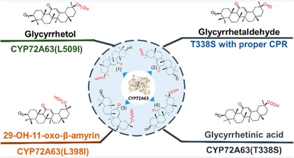 本文利用甘草中合成甘草次酸的P450單加氧酶CYP72A63基于同源建模與分子對接等技術進行輔助理性設計,重塑其活性口袋以控制對于不同中間產物的契合度。通過提高甘草次醇的契合度實現了甘草次酸特異性合成,通過降低甘草次醇的契合度防止了其進一步氧化實現了甘草次醇的特異性合成。通過控制C-29和C-30相對于血紅素鐵的相對位置,實現了對底物C-29的特異性氧化,進一步通過CPR的匹配優化首次實現了甘草次醛類中間產物的特異性合成。同時利用釀酒酵母的體內驗證方式解決了突變體體外試驗難以進行的問題。