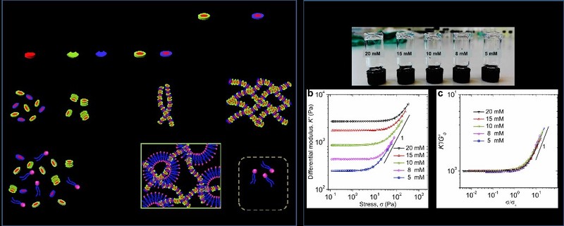 生物組織是由蛋白質砌塊組裝得到的半柔性(Semiflexible)生物微絲交織而成的三維網絡結構,在應對外界機械力的刺激時,會表現出獨特的應變增強特性(Strain-stiffening),以保護機體免受外界應力的傷害。長期以來,人們利用小分子砌塊,通過超分子組裝的方式,制備出了一系列類似生物組織的超分子水凝膠材料,并在生物醫藥、仿生、光電等領域表現出巨大的應用前景。然而,生物組織所表現出的應變增強特性在人工合成型超分子水凝膠材料中極其罕見。
