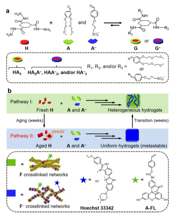 在該研究工作中,該團隊發展了一種獨特的、利用分子老化誘導成核組裝的控制手段,實現了具有瞬態特性的超分子水凝膠材料的制備。研究人員在一前期構筑的模塊化超分子組裝體系(Angew.Chem. Int.Ed. 2019, 58,3800; J. Am. Chem. Soc. 2019, 141, 2847)基礎上,發現通過對模塊分子進行溫和的老化處理,即可誘導改變后續分子的組裝路徑,由自發條件下的親熱力學控制轉變為親動力學控制,組裝形成一種獨特的亞穩態超分子水凝膠材料。進一步研究發現,體系中的組裝前體分子在老化處理過程中,自組裝成納米級的聚集體,該聚集體作為成核中心,改變了分子組裝成核過程,誘導組裝過程轉變為親動力學控制型,最終形成動力學控制的超分子組裝產物。該超分子凝膠表現出獨特的瞬態特性,其結構隨時間可進行緩慢的演變,最終轉變為相對穩定的凝膠狀態。