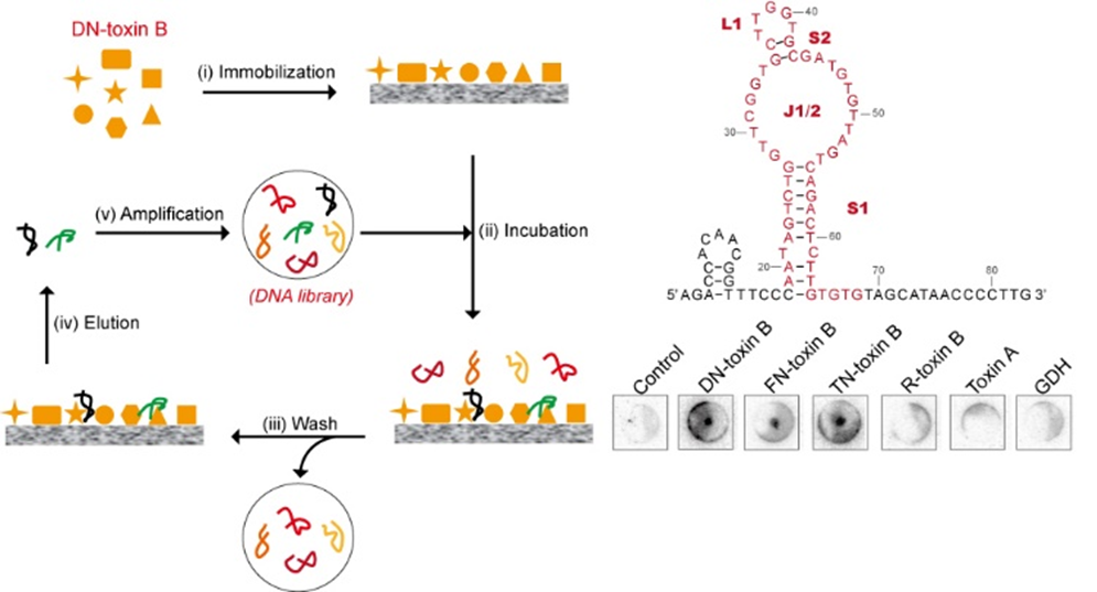 針對以上難點,大連理工大學劉猛課題組首先開發了新型核酸適配體體外篩選方法,得到了可以識別毒素B降解片段(DN-toxin B)的適配體,兩者的結合能力在nM級別。此外,該適配體可以結合天然毒素B(FN-toxin B)和熱處理的毒素B(TN-toxin B),對于重組型毒素B(R-toxin B)、毒素A(toxin A)和谷氨酸脫氫酶(GDH)等表現出良好的選擇性。進一步研究發現,適配體識別的毒素B降解片段的分子量在50 kDa左右。