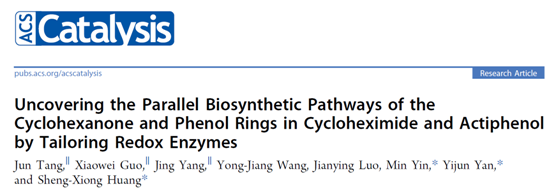 近日,云南大學醫(yī)學院尹敏課題組聯(lián)合中國科學院昆明植物研究所黃勝雄研究員課題組,在催化領域知名期刊ACS Catalysis上發(fā)表了題為“Uncovering the Parallel Biosynthetic Pathways of the Cyclohexanone and Phenol Rings in Cycloheximide and Actiphenol by Tailoring Redox Enzymes”的研究論文。該研究揭示了苯酚和環(huán)己酮在相同生物合成機制下形成的一種罕見且不同的級聯(lián)氧化還原機制,涉及由羧酸還原酶和CYP450協(xié)同催化PKS產(chǎn)物引發(fā)的分子內(nèi)羥醛縮合反應。這一發(fā)現(xiàn)擴展了對天然藥物分子生物合成中氧化還原酶介導的酚和環(huán)己酮基團形成的理解,并為未來的組合生物合成新藥研發(fā)奠定了基礎。近年來,尹敏研究團隊以云南本地多種中草藥為研究對象,構建了藥用植物內(nèi)生放線菌庫,通過多組學聯(lián)合運用高效發(fā)現(xiàn)了系列高潛力菌株,獲得了多個活性新天然產(chǎn)物,進而開展了生物合成機制的研究。