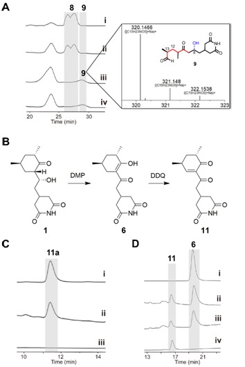 ChxG化合物8生成9。 (B)由化合物1(CHX)化學合成化合物11和6。(C) ChxI、ChxJ和ChxG與3孵育,11易于發(fā)生酮烯醇互變異構生成11a。(D) NADPH在添加或不添加ChxG的情況下分別與11共孵育。