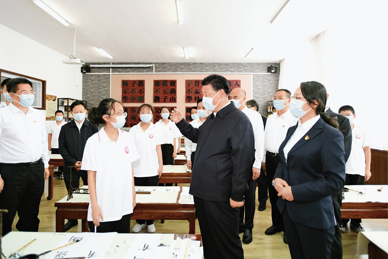 2021年9月13日至14日,中共中央總書記、國家主席、中央軍委主席習(xí)近平在陜西省榆林市考察。這是14日上午,習(xí)近平在綏德實(shí)驗(yàn)中學(xué)考察時(shí),同正在練習(xí)書法的學(xué)生親切交流。 新華社記者 李學(xué)仁/攝