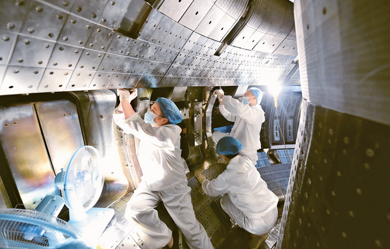 2021年5月28日,中國科學院合肥物質科學研究院有“人造太陽”之稱的全超導托卡馬克核聚變實驗裝置(EAST)創造新的世界紀錄,成功實現可重復的1.2億攝氏度101秒和1.6億攝氏度20秒等離子體運行,向核聚變能源應用邁出重要一步。圖為工作人員對全超導托卡馬克核聚變實驗裝置(EAST)進行升級改造。 新華社記者 周牧/攝
