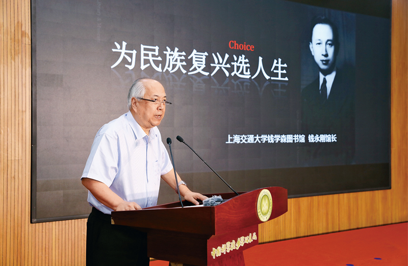 2021年7月15日,中國科學院在該院力學研究所為首個弘揚科學家精神示范基地授牌,并為以錢學森、趙九章、施雅風等老科學家命名的首批三支科技攻關突擊隊授旗。圖為活動現場,錢學森之子錢永剛講述錢學森的五次人生選擇。 新華社記者 金立旺/攝