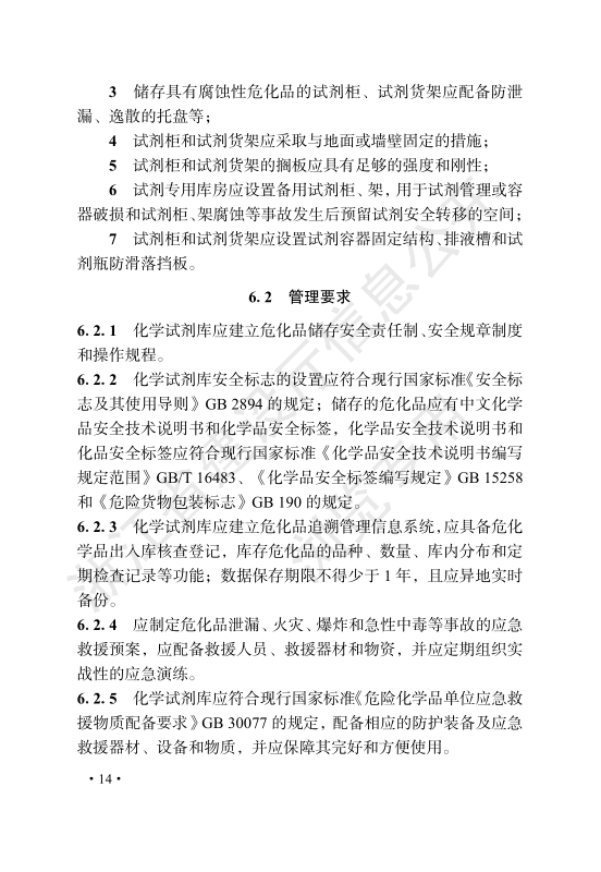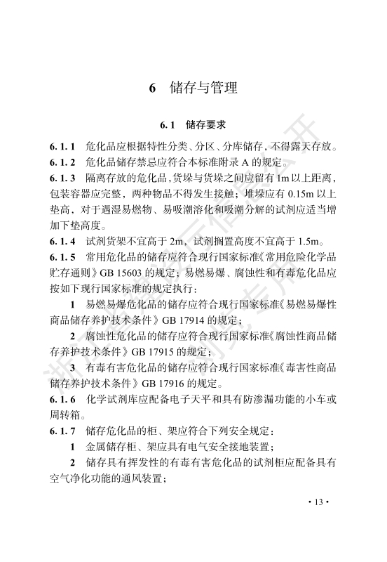 12. 危化品的儲存量不應大于現行國家標準《危險化學品重大危險源辨識》GB 18218 中危化品臨界量的 50%;試劑專用庫房的試劑總儲存量不應大于 10t,其中甲類試劑儲存量不應大于 3t,且每平方米的試劑儲存量不應大于 0.3t。
