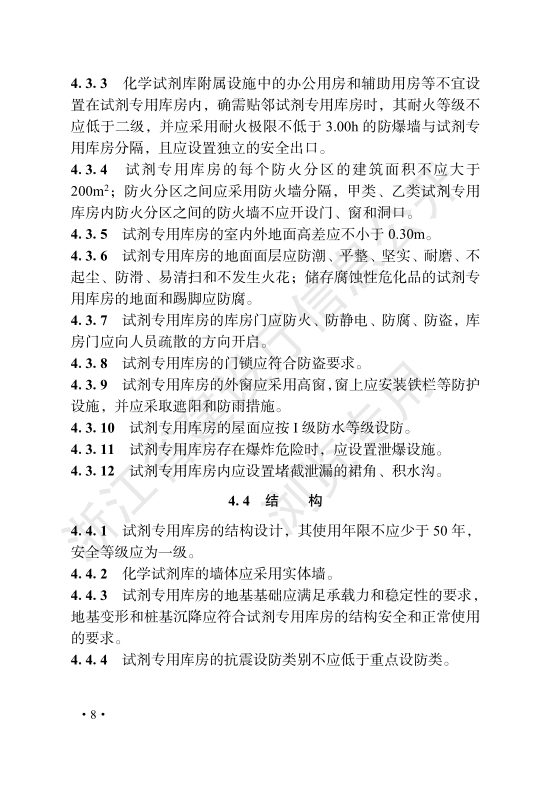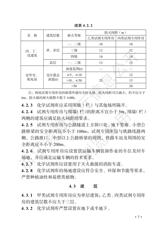 7. 試劑專用庫房應根據儲存物品的火災危險性和儲存物品中可燃物數量等因素,劃分為甲類、乙類和丙類;試劑專用庫房的火災危險性分類應符合現行國家標準《建筑設計防火規范》GB 50016 的相關規定。