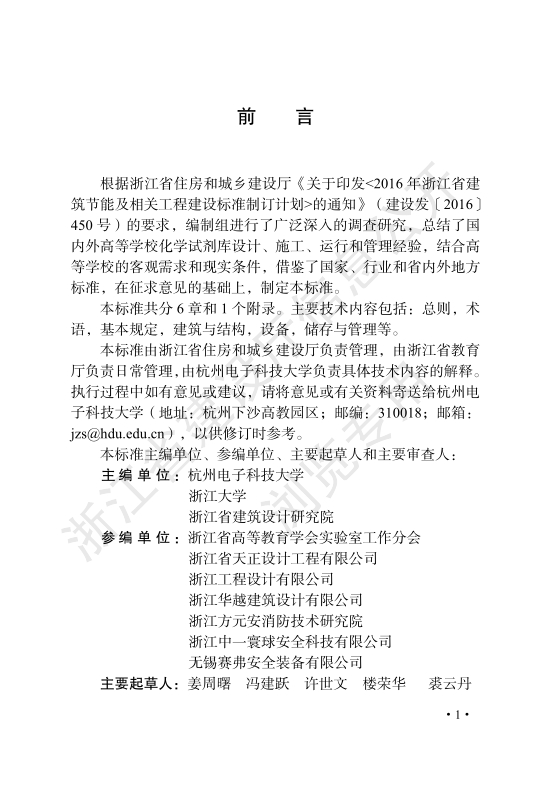 2015年6月,杭州電子科技大學在進行試劑庫建設的同時,開展標準規范研究。項目組邀請精通國家相關標準規范內容、具有豐富從業經驗的各專業領域知名專家,依據工作內容,組成選址與總平面、建(構)筑物、消防設施及給排水、工藝技術及儲存設備、暖通空調、電氣與通信和安全技術防范等7個工作組。負責項目的組織和具體實施。編制組制定了《編制工作計劃》,明確規定了項目的具體內容、時間與進度,技術導則的規范性內容,確保標準的科學、嚴肅性。
