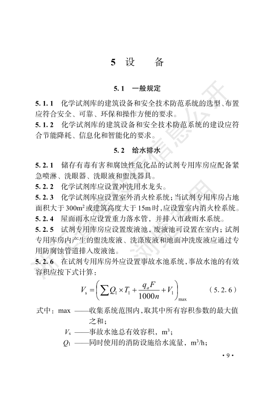 5. 化學試劑庫應包括試劑專用庫房和附屬設施;試劑專用庫房用于試劑的儲存和收發;附屬設施可包括消控、安防和配電等輔助用房,資料存儲、監控、更衣和衛生等辦公用房,廢液池和事故水池等安全設施,以及滿足消防、運輸等要求的場地。