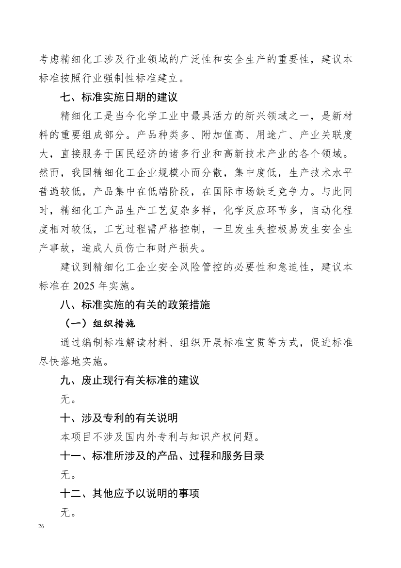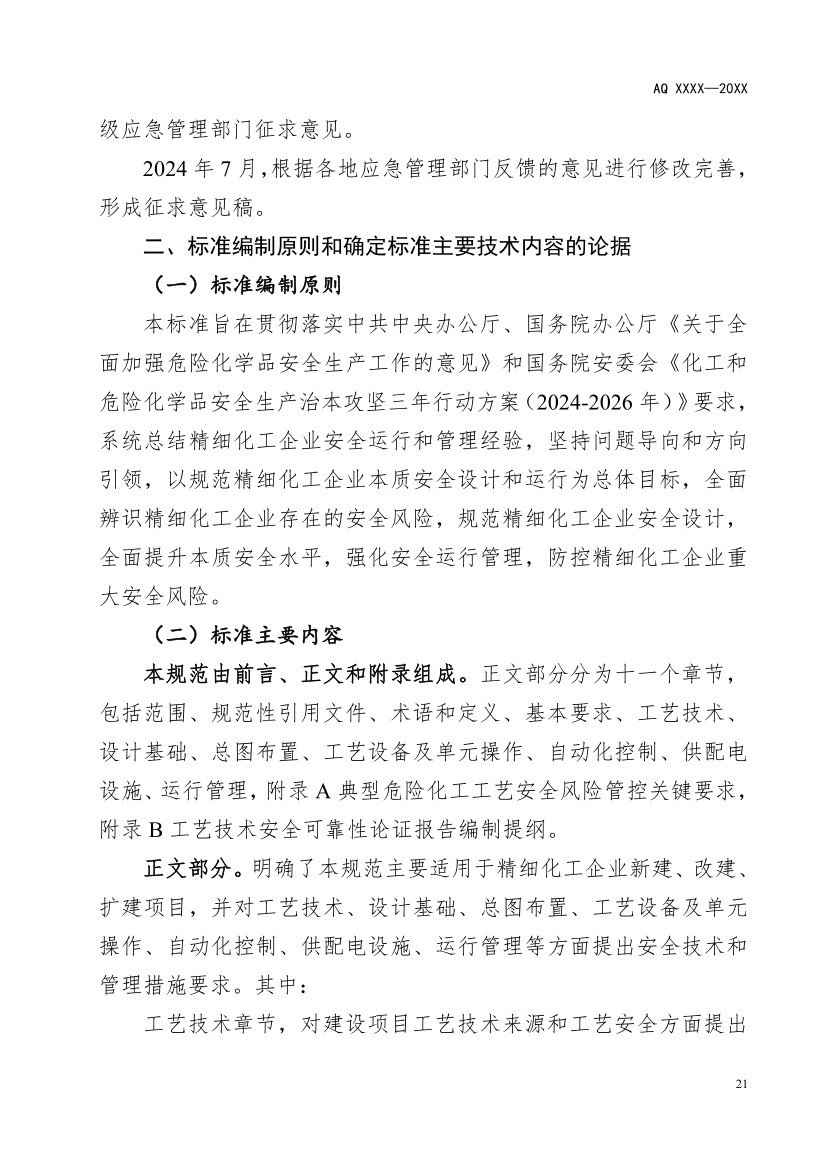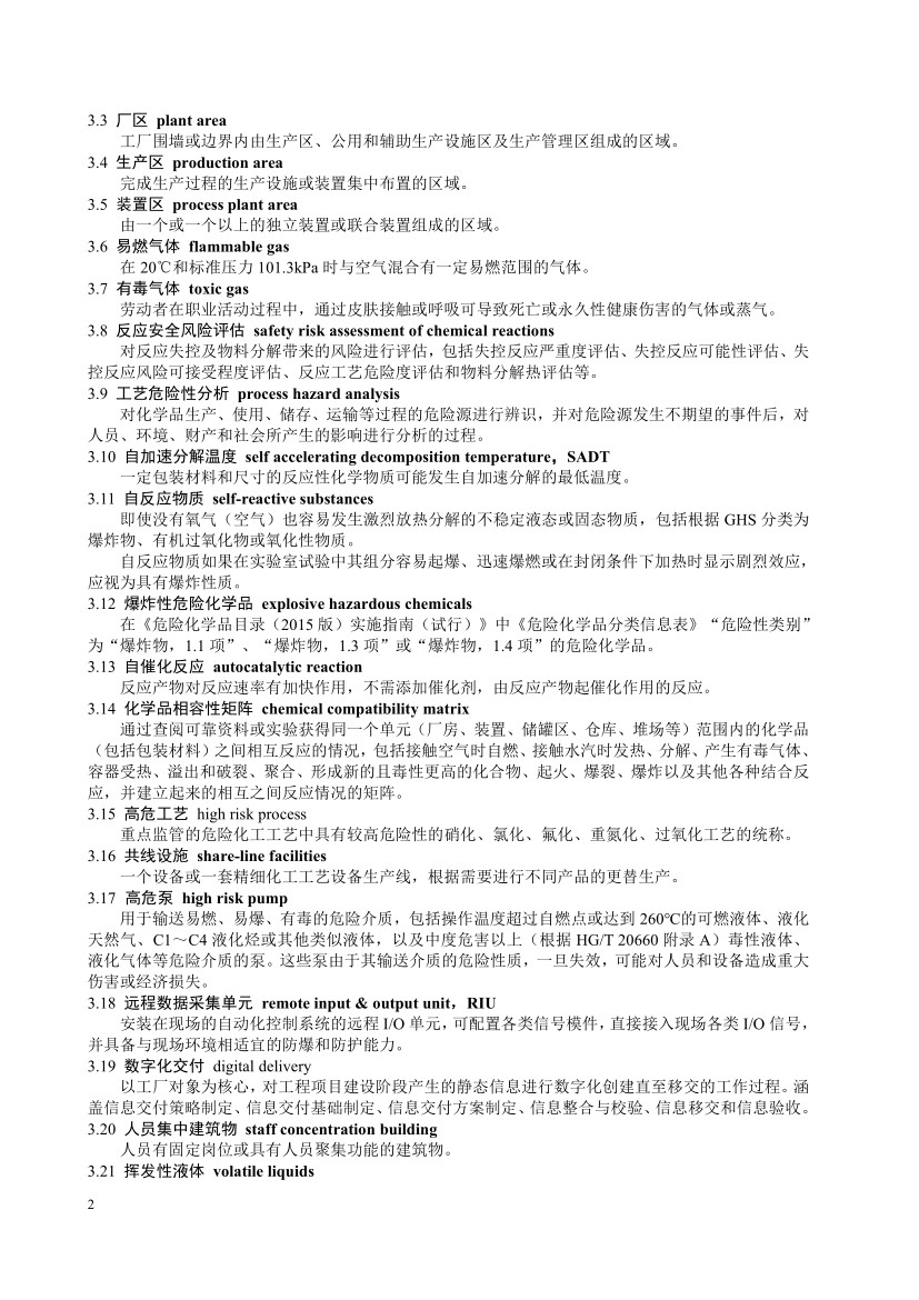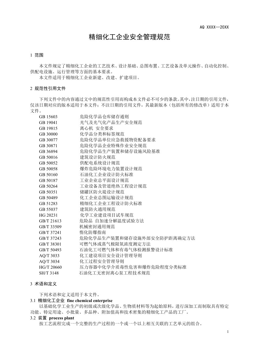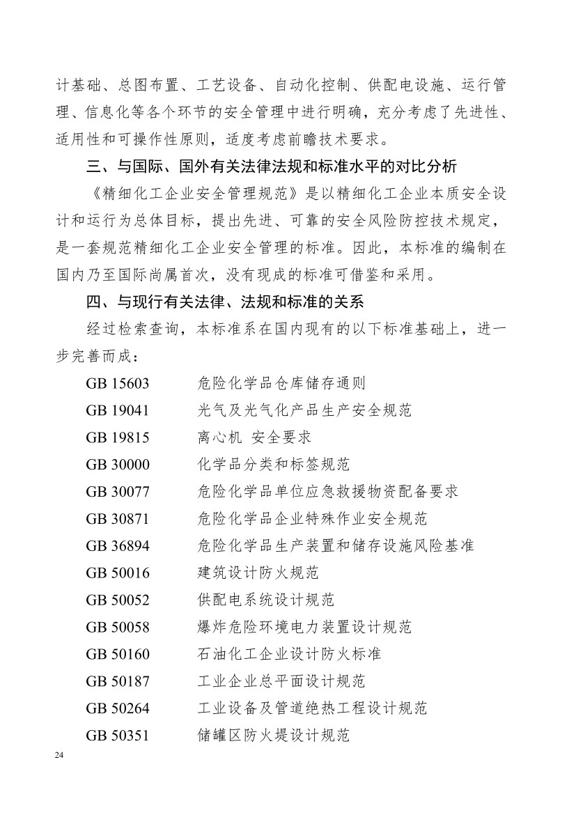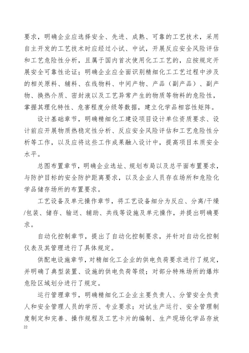 正文部分。明確了本規范主要適用于精細化工企業新建、改建、擴建項目,并對工藝技術、設計基礎、總圖布置、工藝設備及單元操作、自動化控制、供配電設施、運行管理等方面提出安全技術和管理措施要求。其中: