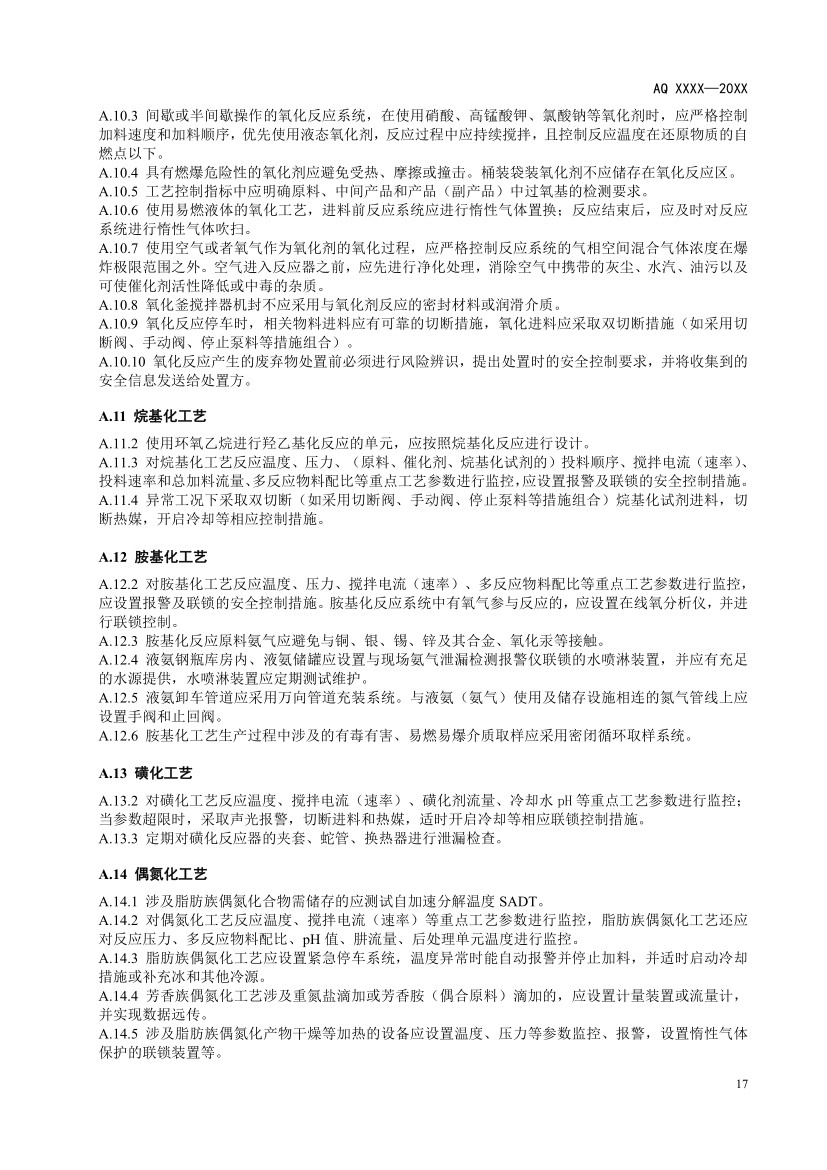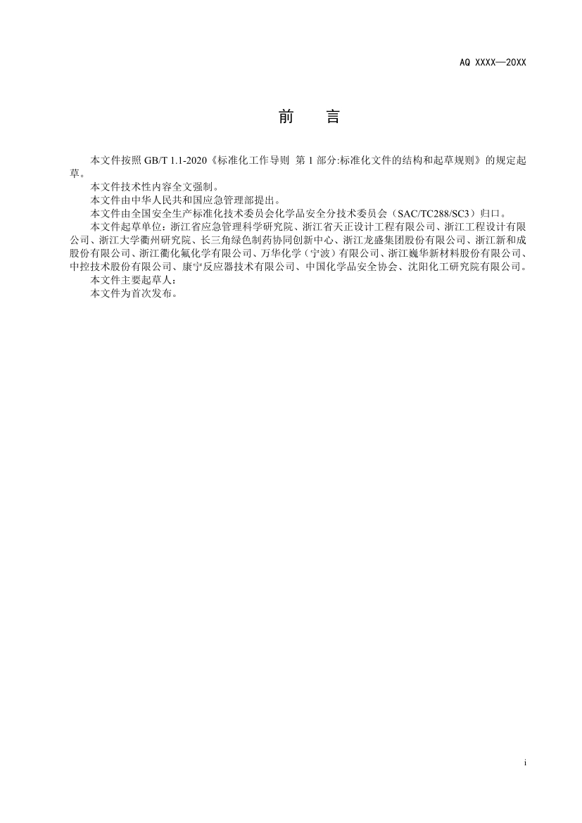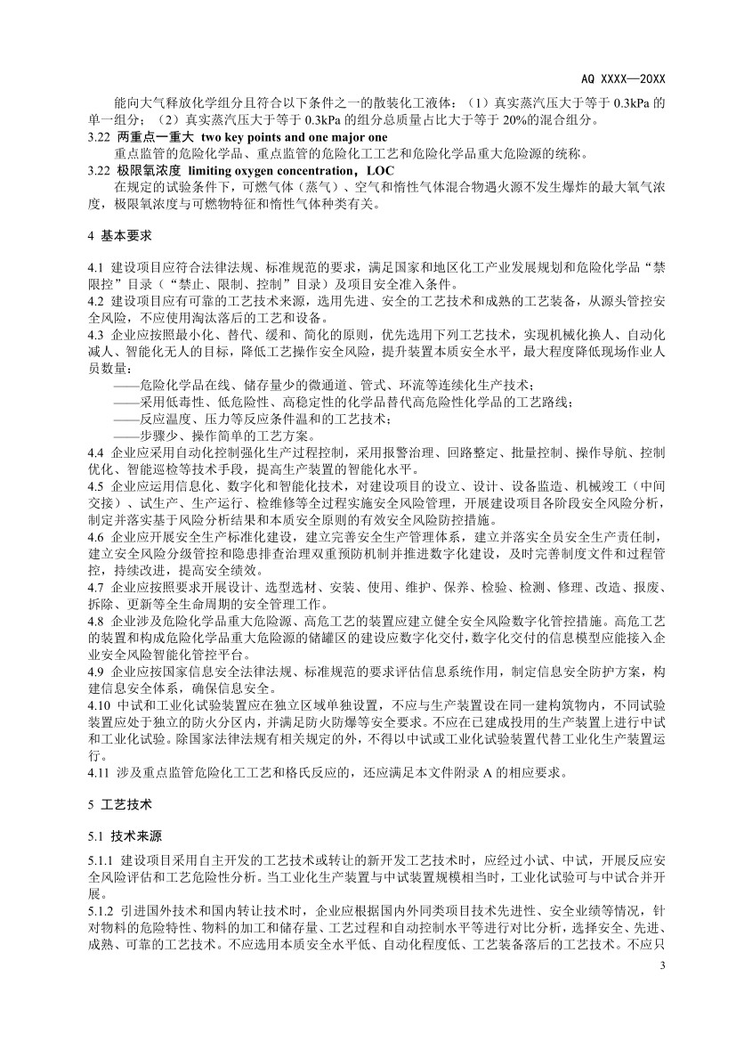 本規范前言、正文和附錄組成。正文部分分為十一個章節,包括范圍、規范性引用文件、術語和定義、基本要求、工藝技術、設計基礎、總圖布置、工藝設備及單元操作、自動化控制、供配電設施、運行管理,附錄A典型危險化工工藝安全風險管控關鍵要求,附錄B工藝技術安全可靠性論證報告編制提綱。