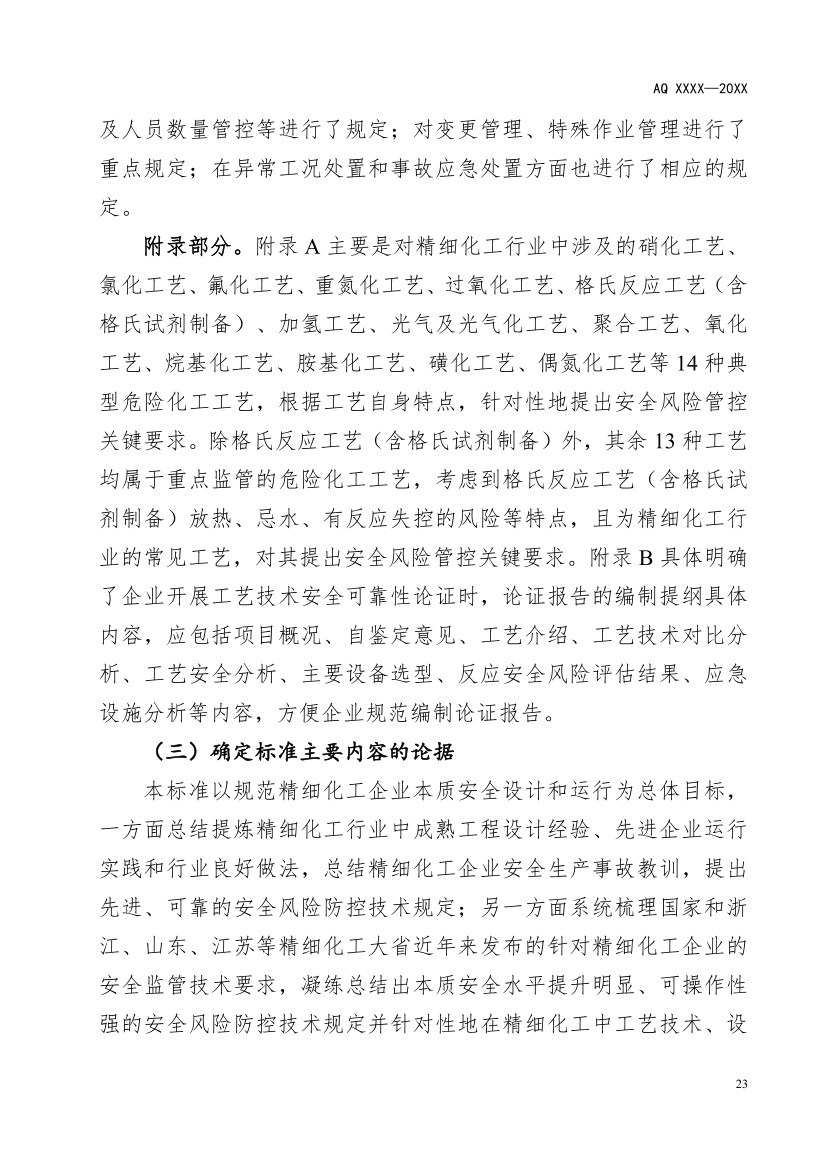 附錄部分。附錄A主要是對精細化工行業中涉及的硝化工藝、氯化工藝、氟化工藝、重氮化工藝、過氧化工藝、格氏反應工藝(含格氏試劑制備)、加氫工藝、光氣及光氣化工藝、聚合工藝、氧化工藝、烷基化工藝、胺基化工藝、磺化工藝、偶氮化工藝等14種典型危險化工工藝,根據工藝自身特點,針對性地提出安全風險管控關鍵要求。除格氏反應工藝(含格氏試劑制備)外,其余13種工藝均屬于重點監管的危險化工工藝,考慮到格氏反應工藝(含格氏試劑制備)放熱、忌水、有反應失控的風險等特點,且為精細化工行業的常見工藝,對其提出安全風險管控關鍵要求。附錄B具體明確了企業開展工藝技術安全可靠性論證時,論證報告的編制提綱具體內容,應包括項目概況、自鑒定意見、工藝介紹、工藝技術對比分析、工藝安全分析、主要設備選型、反應安全風險評估結果、應急設施分析等內容,方便企業規范編制論證報告。