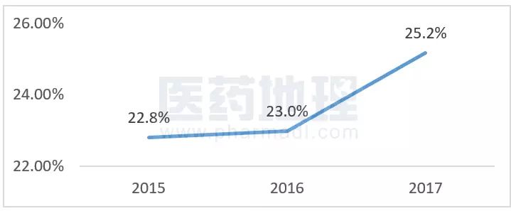 此外,百強企業資源整合步伐加快,集中程度大幅提高。數據顯示,百強企業集中度由2016年的22.98%上升至25.17%,2017年百強企業在行業規模以上醫藥企業的主營收入占比達25.17%,向“十三五”規劃提出的目標再進一步。