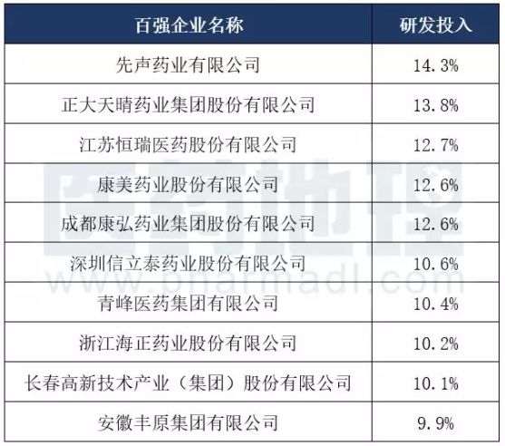 其中,高研發型企業數大幅增加。百強研發投入占營業收入大于10%的企業數量相比2016年的3家增加至9家,這9家企業分別是先聲藥業14.3%,正大天晴13.8%,恒瑞醫藥12.7%,康美藥業12.6%,成都康弘12.6%,深圳信立泰10.6%,青峰醫藥10.4%,浙江海正10.2%,長春高新10.1%。