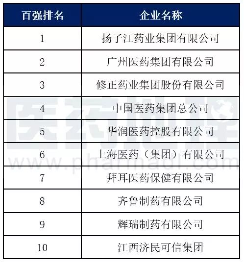 百強榜單中前十強企業歷來備受業界關注。與上一屆榜單相比,2017年十強企業與2016年相比排名不變,揚子江藥業、廣州醫藥、修正藥業位列一、二、三名,中國醫藥、華潤醫藥、上海醫藥、拜耳醫藥、齊魯制藥、輝瑞制藥、濟民可信位列第四至第十名。