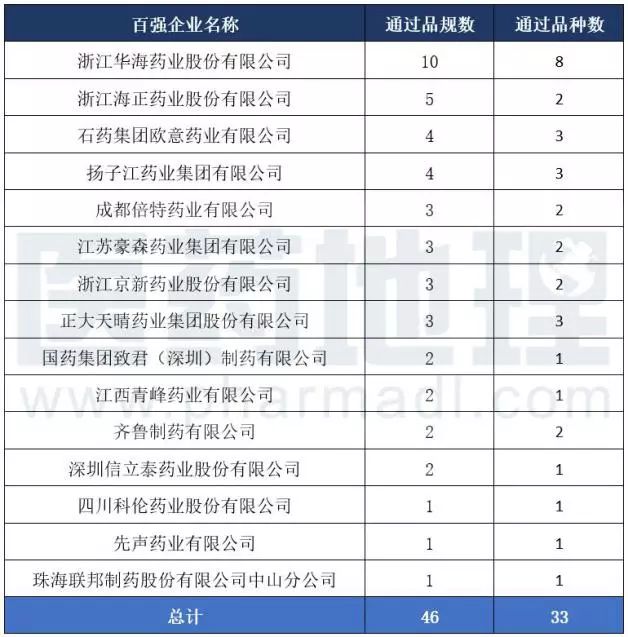 一致性評價目錄公布,百強企業滿載而歸。據統計,國家藥監局公布的五批通過一致性評價的仿制藥品種/規格,共計57個,百強企業率先通過46個品種/規格,占比81%,其中華海藥業10個,海正藥業5個,石藥集團歐意藥業4個,揚子江藥業4個,成都倍特藥業3個,豪森藥業3個,京新藥業3個,正大天晴3個。