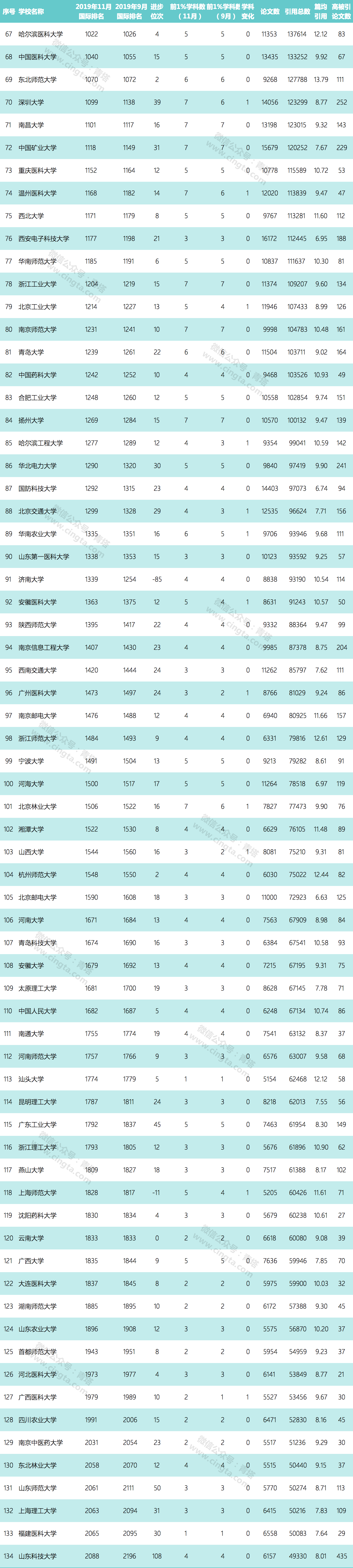 2019年11月的各校ESI綜合排名情況如下(按照各高校論文總引用次數進行排名;中國地質大學、中國石油大學和中國礦業大學三所高校并沒有區分兩地辦學的情況):