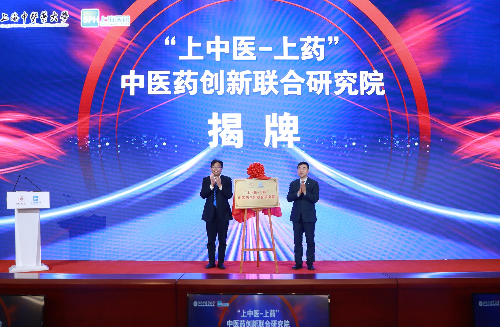 上海中醫藥大學黨委書記曹錫康與上海醫藥集團黨委副書記、上海醫藥副總裁趙勇,為雙方聯合籌辦的“上中醫-上藥”中醫藥創新聯合研究院揭牌。