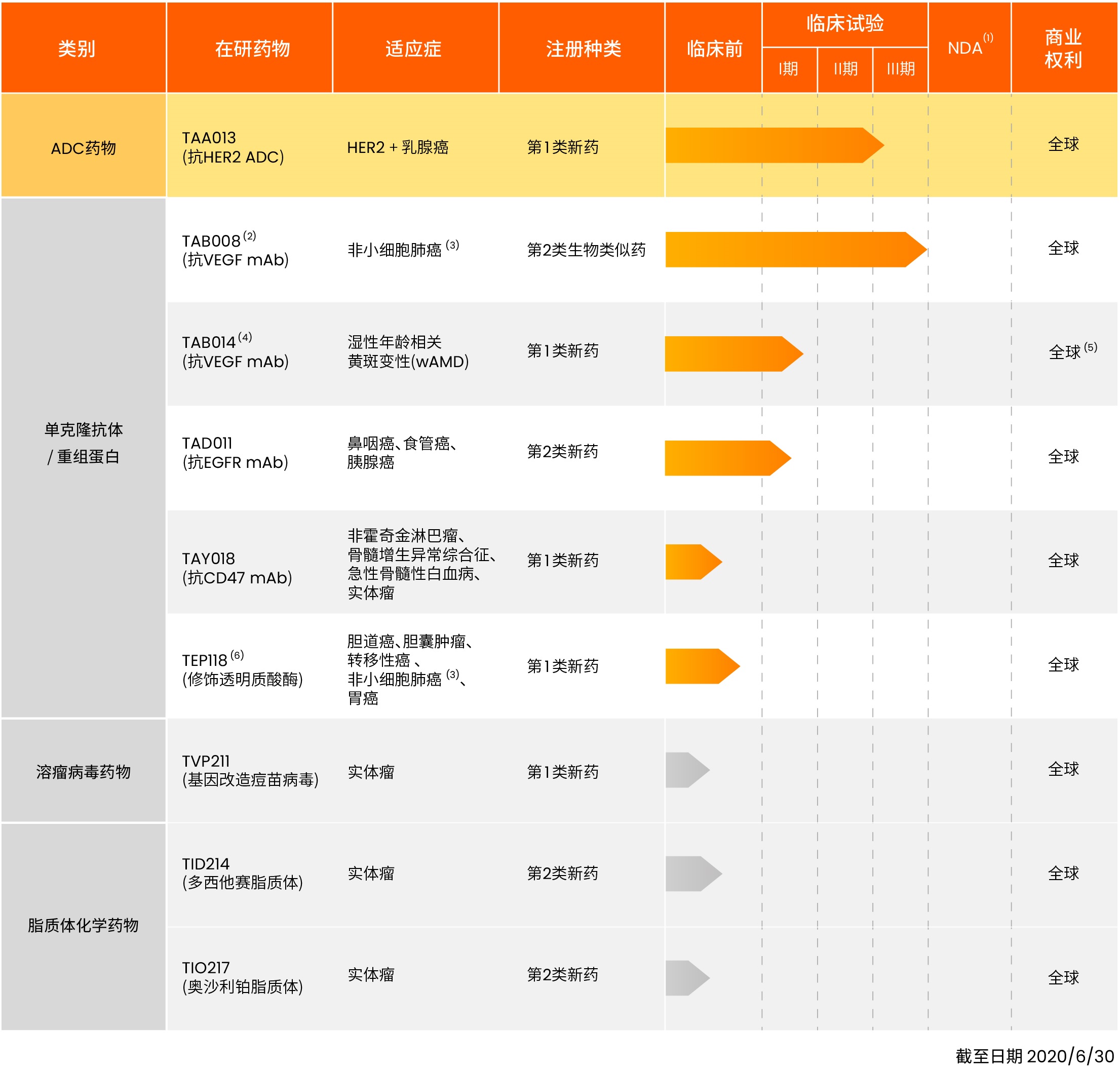 我們擁有針對各類癌癥的綜合性在研腫瘤藥物組合,當中包括多種單克隆抗體(mAb)、抗體偶聯藥物(ADC)、溶瘤病毒藥物及特種腫瘤藥物(如脂質體藥物)。我們的策略是開發極具可商業化潛力及市場需求清晰的創新型藥物。目前共有12 個在研藥物,包括7種在研生物藥及5種在研化學藥。