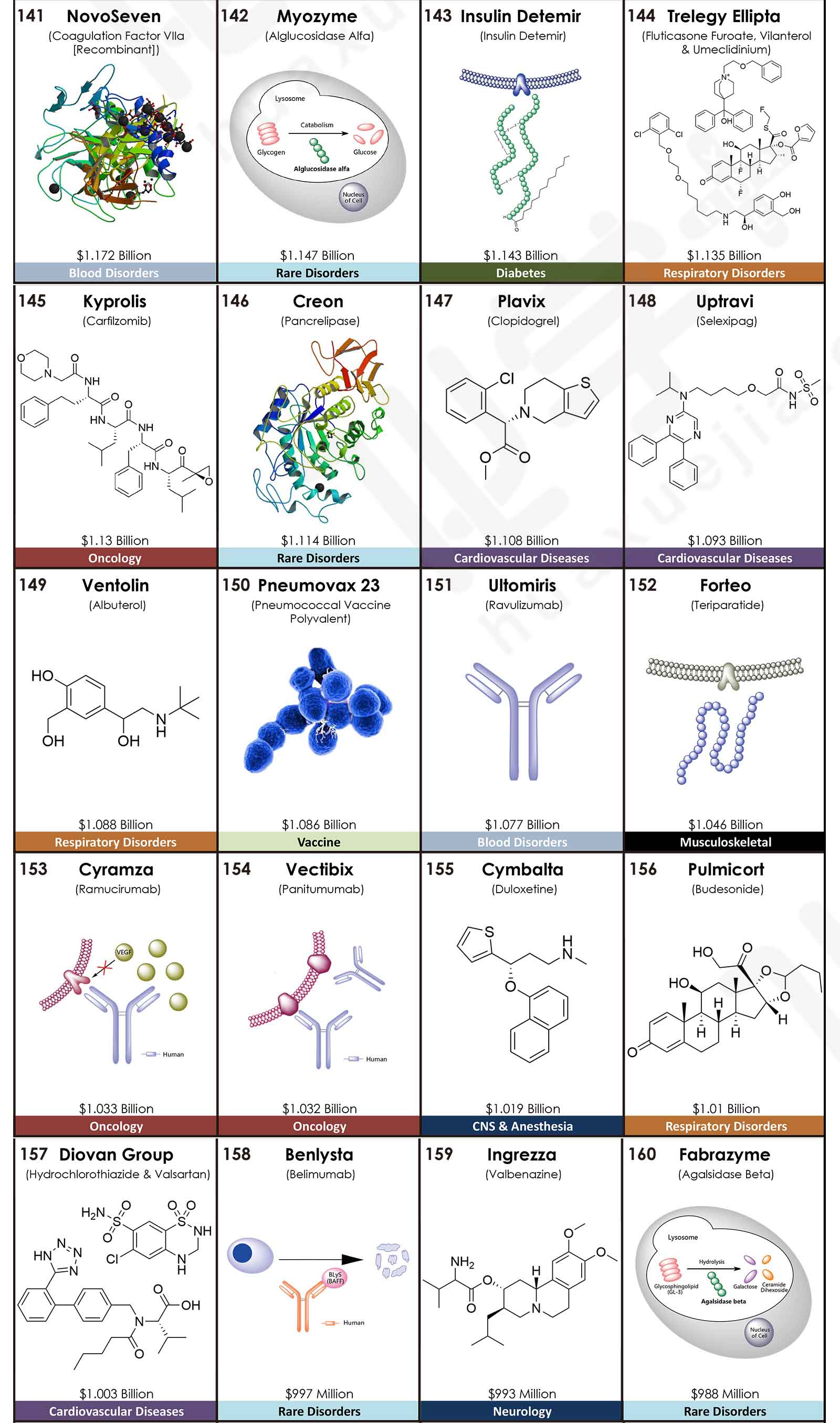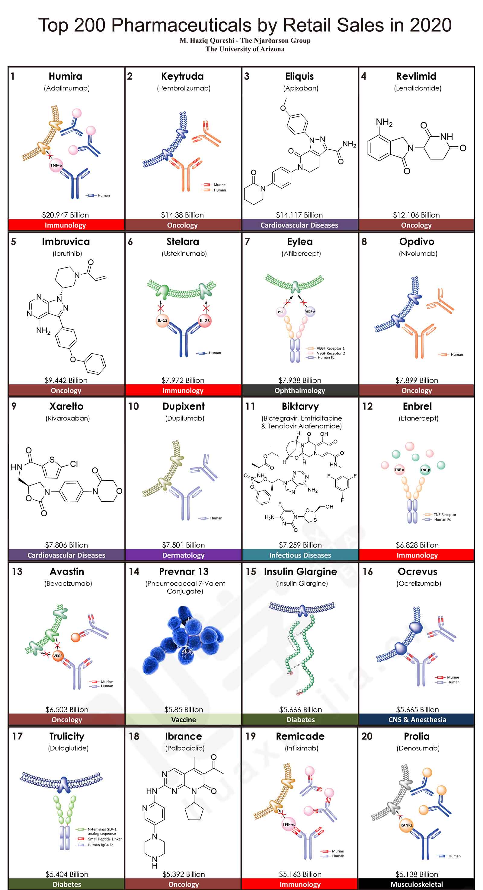 來自美國亞利桑那大學Njardarson研究團隊發(fā)布了2020年全球銷售額TOP200藥物排行榜,200款產(chǎn)品的合計銷售額高達4996.28億美元。其中,最暢銷的TOP5藥物分別是:Humira(阿達木單抗),銷售額是209.47億美元;Keytruda(派姆單抗),銷售額是143.80億美元;抗凝血藥物Eliquis(阿哌沙班),銷售額是141.17億美元;Revlimid(來那度胺),銷售額是121.06億美元;Imbruvica(伊布替尼),銷售額是94.42億美元。這五款藥品在2019年同樣位于前五,2020年的銷售額均比上一年有較大幅度的增長,同比增長率分別為:6.2%、29.7%、16.2%、29.1%和16.8%。其中,Keytruda在2019年的排名為第三,2020年上升一位;而Eliquis在2019年的排名為第二,2020年下滑一位。