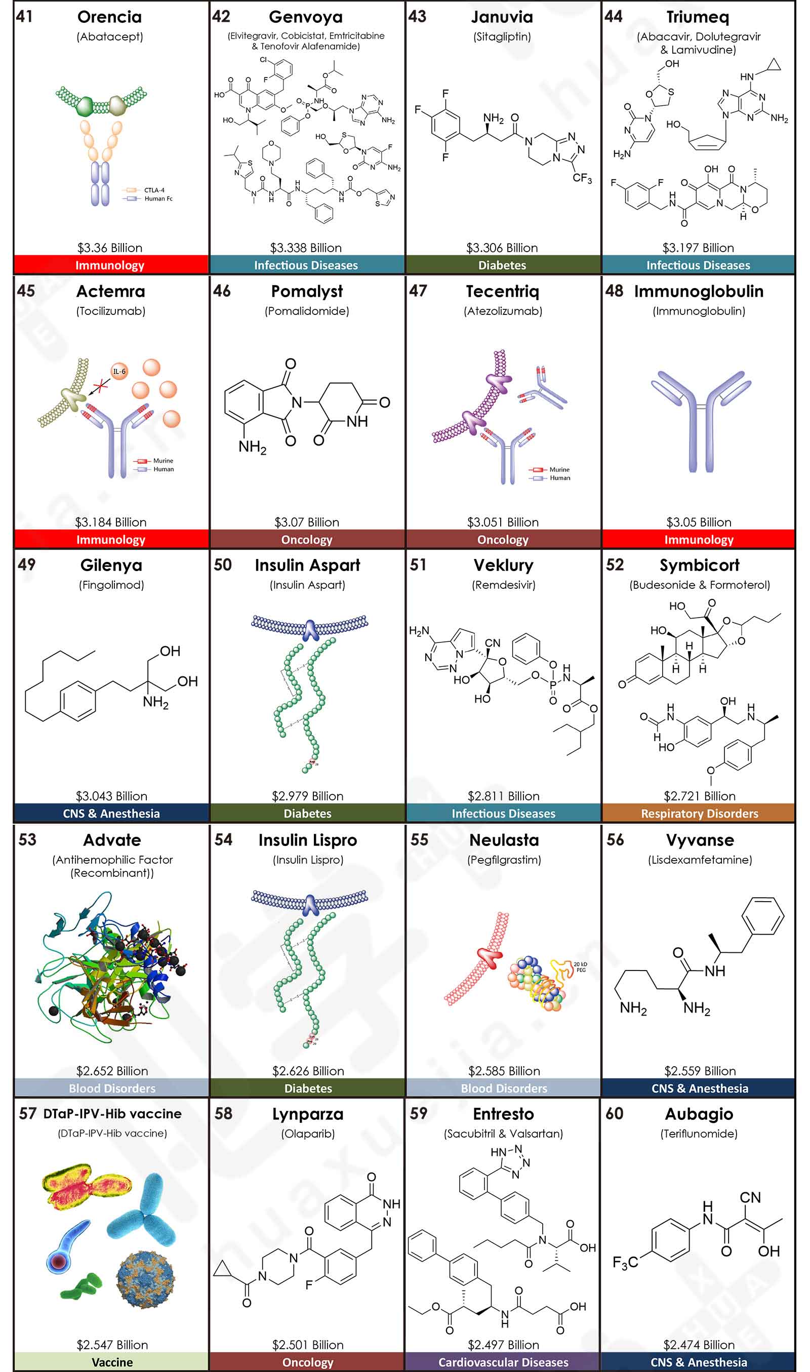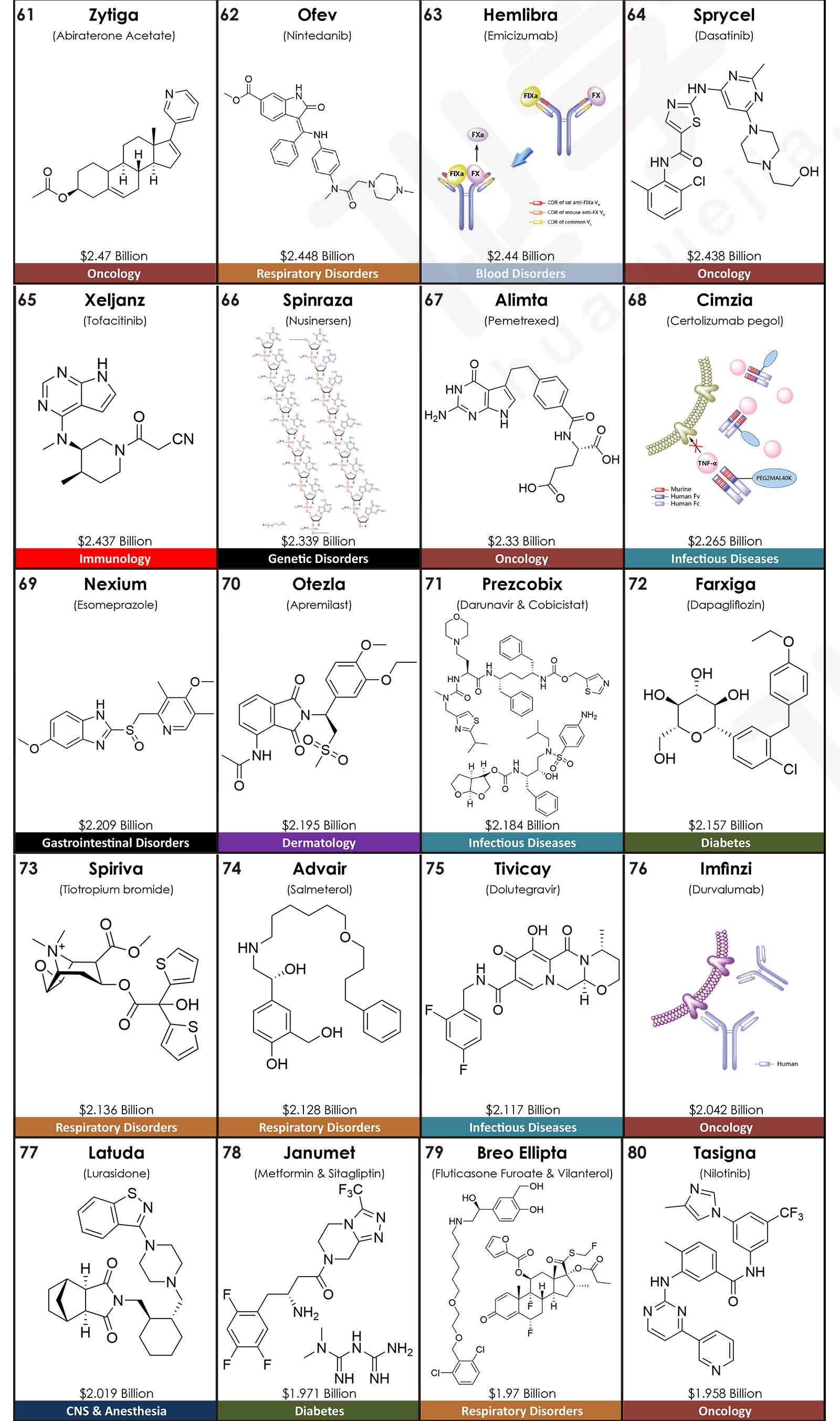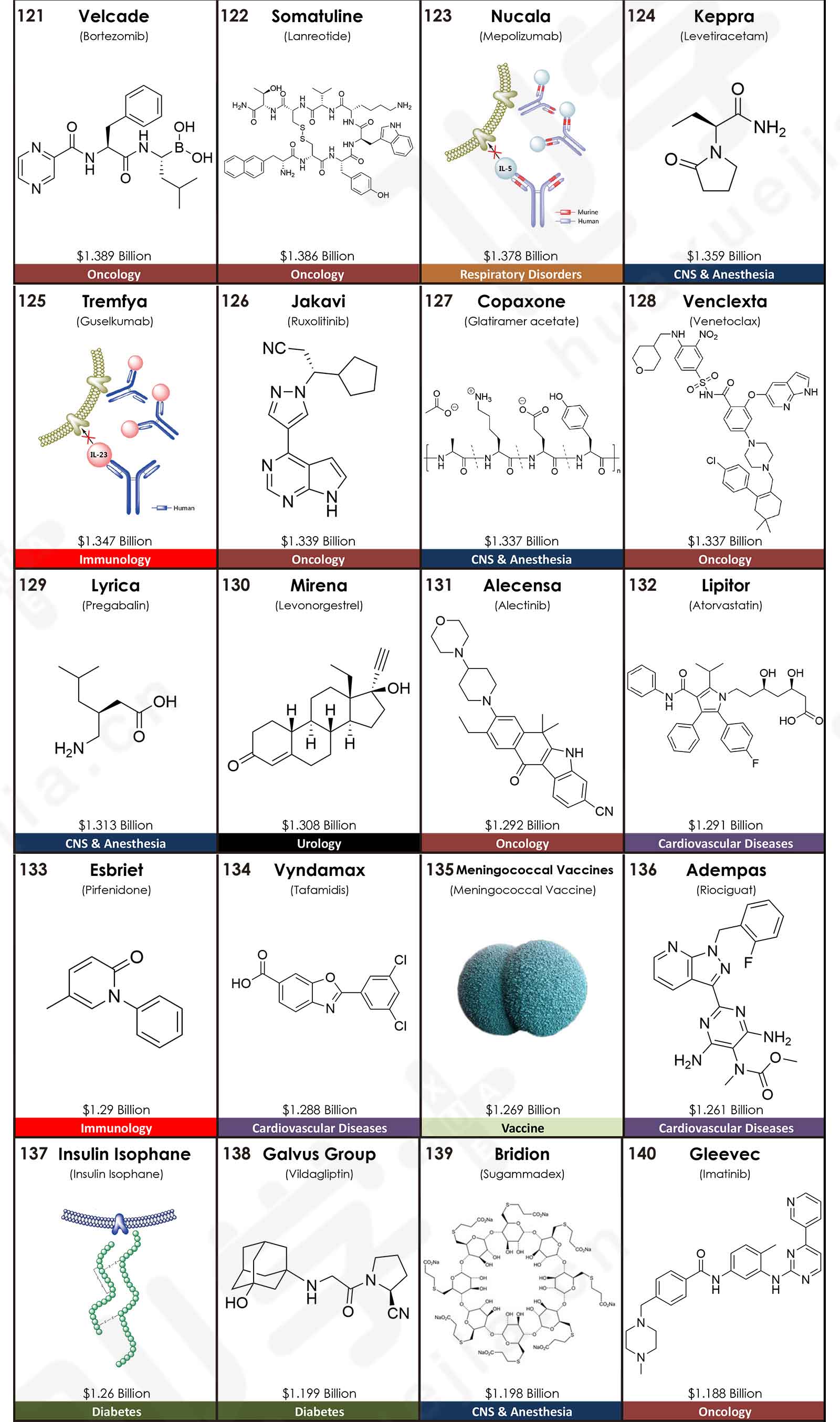 值得注意的是,TOP5排名中有3款抗腫瘤類藥物:Keytruda(派姆單抗)、Revlimid(來那度胺)、Imbruvica(伊布替尼),它們的銷售額合計占TOP5藥品總額的一半,達到50.6%。