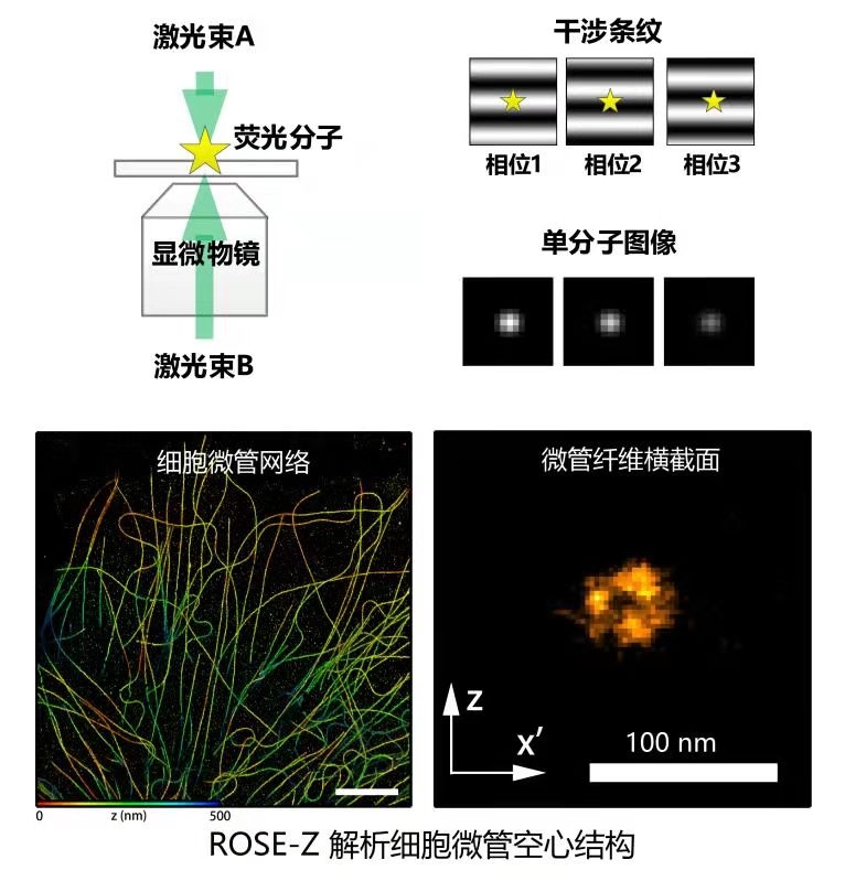 細胞的生理過程是由納米尺度的生物分子執行的,因此對生命活動更深入的理解需要納米分辨率的成像技術。中國科學院生物物理研究所徐濤院士組和紀偉研究組組成的技術攻關團隊,一直聚焦于突破光學顯微成像分辨率的研究,前期發展的ROSE顯微鏡把側向(X-Y)分辨率提高到納米水平(Nature Methods,2019),基于干涉定位創新原理又研制出ROSE-Z顯微鏡,進一步突破了軸向(Z)分辨率,可解析納米尺度的亞細胞結構,為生命科學研究提供了有力工具。該研究表明光學顯微鏡已經步入納米分辨率時代,我國科學家在該領域具備多學科交叉技術創新能力,研制的具有自主知識產權的新型超分辨成像設備處于國際領先地位。