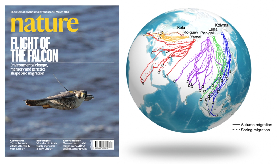 中國科學院動物研究所詹祥江團隊歷時12年,通過整合多年衛星追蹤數據和種群基因組信息,建立了一套大陸尺度的的北極游隼(Falco peregrinus)遷徙研究系統。研究人員闡明了氣候變化在鳥類遷徙路線形成、維持及未來變化趨勢中的驅動作用,發現一個和記憶能力相關的基因ADCY8在遷徙距離更長的游隼種群中受到正選擇,揭示了長時記憶可能是鳥類長距離遷徙的重要基礎。該研究全面結合遙感衛星追蹤、基因組學、神經生物學等新型研究手段,展現了學科交叉型的創新性研究在回答重大科學問題中的關鍵作用。