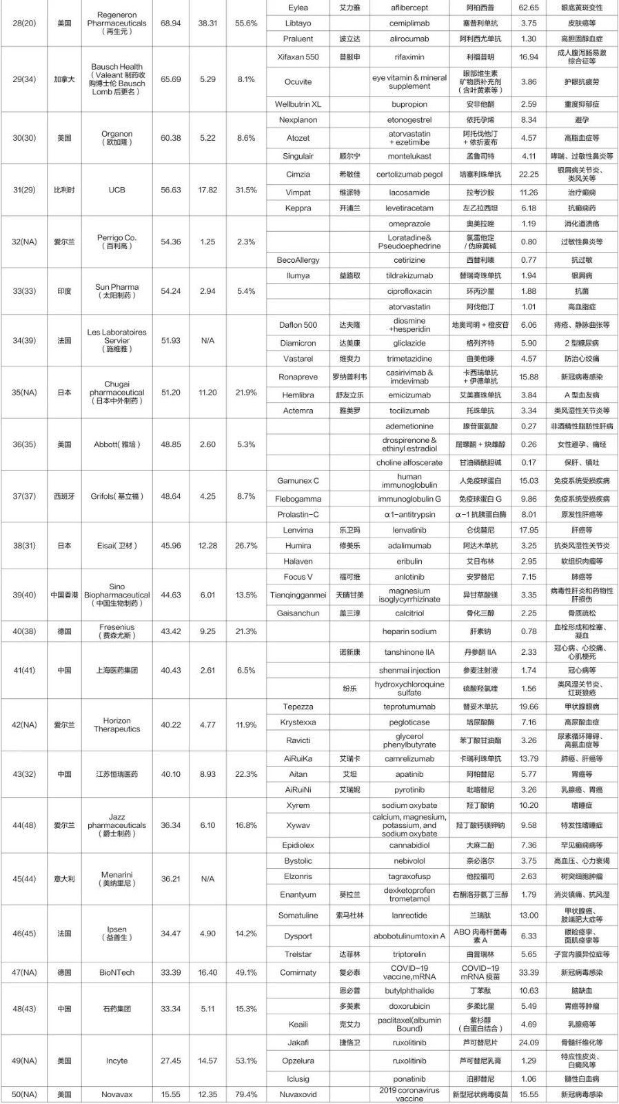 資料顯示,2023年的50強與2022年相比有些許變化。原50強企業(yè):美國亞力兄(2022年42位)被阿斯利康收購并表后徹底消失,而住友日本制藥(2022年36位)、印度阿拉賓度(2022年46位)、德國Stada(史達德)(2022年47位)、愛爾蘭Endo International(遠(yuǎn)藤國際制藥)(2022年49位)和日本協(xié)和麒麟(2022年50位)等5家企業(yè)跌出榜單,住友日本制藥估計是統(tǒng)計遺漏的原因,就像今年第35名的日本中外制藥,去年也沒有進入榜單,今年又突然冒了出來。后面原先排在榜單末尾的4家更多可能會受匯率的影響,但是相信會比今年的第50名美國Novavax的15.55億美元要高。6家企業(yè)新進入50強,分別是首次進入榜單的愛爾蘭百利高(第32名)、去年估計遺漏而今年再次進入榜單的日本中外制藥(第35名)、首次進入榜單的愛爾蘭Horizon Therapeutics(地平線治療)(第42名)、首次進入榜單的靠新冠疫苗銷售的德國BioNTech(第47名)、首次進入榜單的美國Incyte(第49名)和美國Novavax(第50名),愛爾蘭百利高是一家總部設(shè)在愛爾蘭都柏林的跨國化學(xué)仿制藥生產(chǎn)公司,有處方藥和OTC藥及特殊藥品,2023年估計是參與了評選,未來有業(yè)務(wù)數(shù)據(jù)細(xì)分后的OTC藥被剔除統(tǒng)計而跌出榜單的可能。日本中外制藥一直是50強榜單的常客,去年估計統(tǒng)計遺漏而今年再次進入榜單,曾位列2021年第41位,2020年第40位,2019年的第39位,2018年和2017年的第37位,2016年和2015年的第38位,2014年的第36位,2013年的第33位,2011年的第26位和2010年的第27位。愛爾蘭Horizon Therapeutics(地平線治療)是一家總部位于愛爾蘭都柏林的全球生物技術(shù)公司,專注于治療罕見,自身免疫和嚴(yán)重炎癥性疾病的藥物,在2022年12月安進宣布將以278億美元收購愛爾蘭Horizon Therapeutics,但2023年5月受到了美國聯(lián)邦貿(mào)易委員會(FTC)的訴訟,擬阻止交易的達成,如果收購達成,則首次進入榜單的Horizon Therapeutics將在明年的榜單中消失。首次進入榜單的德國BioNTech是僅靠一款新冠疫苗進入50強的專注于mRNA疫苗的企業(yè),BioNtech獨自負(fù)責(zé)復(fù)必泰(Comirnaty)在德國和土耳其區(qū)域的銷售就獲得了33.39億美元,而輝瑞與之合作負(fù)責(zé)其它地區(qū)的銷售。美國Incyte是一家2002年最初由一群科學(xué)家創(chuàng)立并逐步發(fā)展成全球性的生物制藥公司,致力于新藥的發(fā)現(xiàn)與開發(fā),主攻腫瘤、炎癥和自身免疫方向,其有第一個批準(zhǔn)的JAK1/JAK2抑制劑。美國Novavax是一家1986年成立并以重組納米顆粒技術(shù)生產(chǎn)重組蛋白疫苗的生物技術(shù)公司,重組蛋白疫苗Nuvaxovid是其首個上市產(chǎn)品,但因管理層決策、產(chǎn)能限制等因素而一拖再拖,距離Moderna和BioNtech的新冠mRNA疫苗上市已遲到了一年多的時間,錯過了“黃金期”。