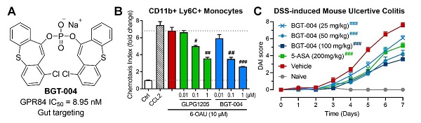 圖1. (A) BGT-004的結構;(B) BGT-004劑量依賴性地抑制GPR84激動劑6-OAU引起的小鼠單核細胞的趨化;(C) BGT-004劑量依賴性地緩解DSS誘導的小鼠急性潰瘍性腸炎。
