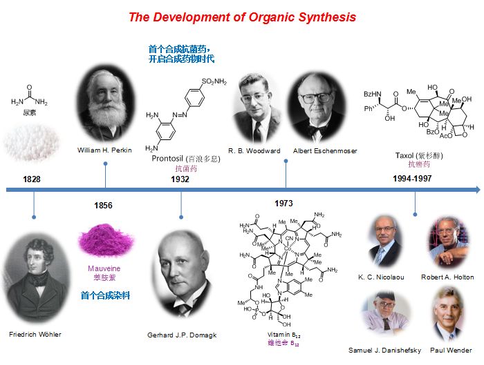 在合成化學上一個里程碑式的工作是1932年Domagk合成出第一類的抗生素的藥物,于我們大家非常熟悉的青霉素的發展還要早個近10年,作為首個合成藥物真正開啟了合成。在人類利用合成化學征服自然、改造自然的過程中,其中有很多里程碑式的工作,比如說像Woodward他完成了維生素B12非常復雜的工作。這標志著人類可以不依賴于生命體,制造出自然界中存在的最復雜的有機分子。但是在近期有很多制藥工業的發展依賴于合成化學。所以合成化學經歷了將近兩百年的發展,為人類社會的文明起到了很大的推動作用。