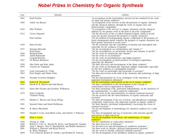 在所有的獲獎人里邊,是Robert B. Woodward和Elas J. Corey開辟了合成化學最偉大的時代,而且確立了合成化學不光是一門科學,同樣也是一門藝術。