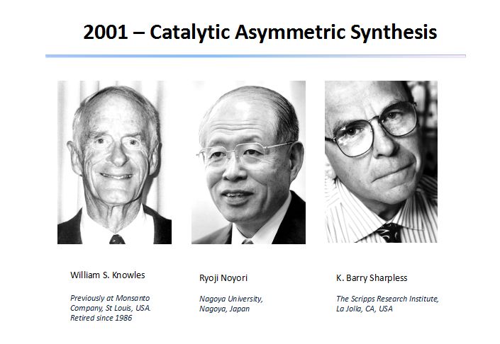 在2001年,諾貝爾化學獎就授予了三位,在手性化合物的高效合成中做出杰出貢獻的科學家。