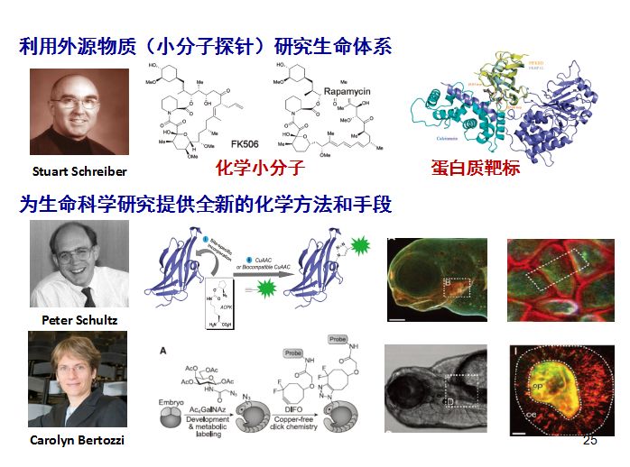 同樣有很多合成化學家,也利用所開發出來的新的合成方法和技術來推動生命科學的發展,比如說像Peter Schultz教授通過去合成非天然氨基酸,通過非天然氨基酸的定點插入技術,解決了很多實際的生命科學領域的問題。像近期Carolyn Bertozzi教授,他們開發出了基于這些有機合成的生物正交反應,并且可以用它進行生物大分子的載體標記。