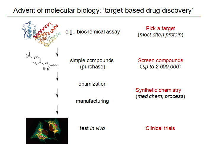 當分子生物學蓬勃發展以來,我們現在創新藥物的研發又有一個新的策略,就是基于一個靶點導向的創新藥物的發現。這里邊實際上是早期的生物學家扮演著很重要的角色,首先通過生物學的發現,你可以找到一個藥物靶點,再通過大規模的篩選化合物,就可以獲得對藥物靶點這么一個調控的分子。同樣合成化學也扮演著一個很重要的角色,只有通過合成化學,才能夠對這些化合物進行結構優化改造,獲得構效關系,最終能夠推進這個藥物的研發。
