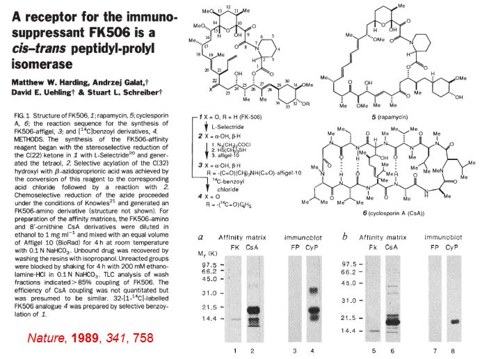 舉兩個實例,從合成化學出發,我們去進一步幫助我們理解生命過程,去發現新的生物機制。比如說最經典的,Stuart Schreiber教授,他們在九十年代初八十年代末所做出的一個非常重要的工作,用天然產物FK506,當時他們在全合成的基礎之上,對這個化合物進行了相應的改造,制備出了分子探針,進一步的用他揭示出和小分子所結合的靶點蛋白,叫做FK506這個結合蛋白。后邊他們又做了很多非常重要的生物機制的研究,證明這個蛋白對于這個生命體的生命過程是具有非常重要的調控作用。