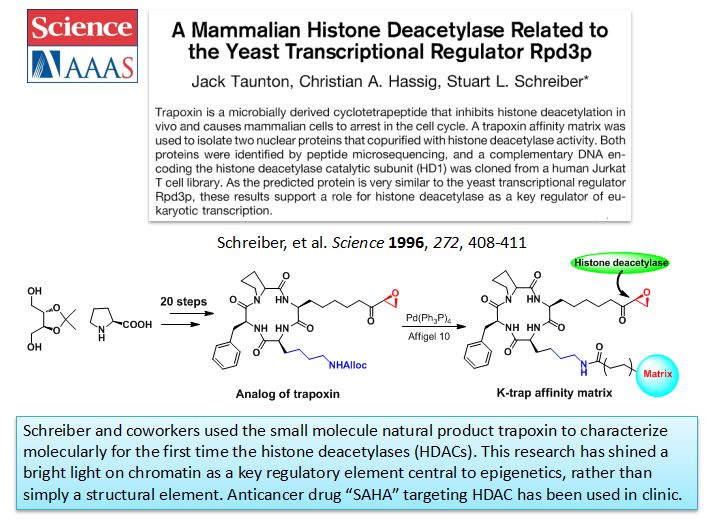 另外一個類似的工作是他們在1996年發表在Science文章上的,當時他們也是利用一個具有抗腫瘤活性的天然產物,叫做trapoxin他們實現了這個化合物的合成,而且進一步的把這個天然產物探針化,通過靶點垂釣實驗,發現這個天然產物的生物靶點實際上叫做組蛋白去乙酰化酶,這個酶實際上是在我們細胞的有絲分裂過程中起到一個非常重要的調控作用。基于這個重要的生物學發現,后邊有很多的生物學家也進行了相應的功能的研究,而且這個工作不光是發現了一個天然產物的靶點蛋白,進一步開拓了一個新興的生命科學的研究領域,大家現在可能都非常熟悉的,表觀遺傳學的研究領域。而且有證明這個組蛋白去乙酰化酶實際上在腫瘤增殖過程中,起到一個非常關鍵的調控作用,所以后邊他們也開發出了相應的小分子抑制劑,并且已經證明作為一個有效的抗腫瘤藥物,目前已經在臨床上被廣泛的使用了。