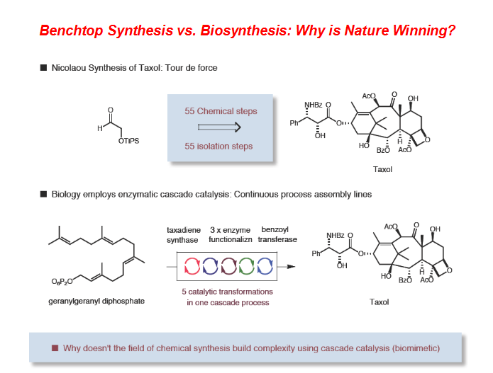 為什么會造成這么一個所謂的紫杉醇的難題?因為對于我們合成化學,特別是在人工合成的過程中,我們會遇到很多效率的問題,而且我們很多人工合成的策略都是一個線性的策略,從一個最原始的最簡單的原料S1出發,我通過一步步的化學轉化,最終拿到TM(target molecule)。在這個過程中你可以設想,如果是一個四十步的合成,每一步合成你的產率如果只有50%的話,那你最終四十步的合成之后,你的產率是非常非常低的。所以這個遠遠的無法滿足實際生產的需求,這也是為什么我們會在合成化學里邊,特別是這種復雜分子多步合成的過程中,我們會面臨一個很巨大的挑戰,會出現像紫杉醇的難題。所以合成化學今后也需要和其他的科學進行交叉融合,特別是和生命科學研究領域的生物合成,要進行相應的互補。