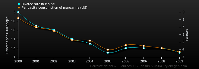 ○ 美國(guó)緬因州的離婚率(藍(lán))與人造黃油的人均消費(fèi)量(橙)。| 圖片來(lái)源:Tyler Vigen/Spurious Correlations