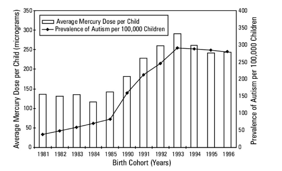 ○ 通過(guò)接觸疫苗而接觸到汞(柱狀圖)與自閉癥的發(fā)病率(點(diǎn)線圖)。| 圖片來(lái)源:David Geier and Mark Geier