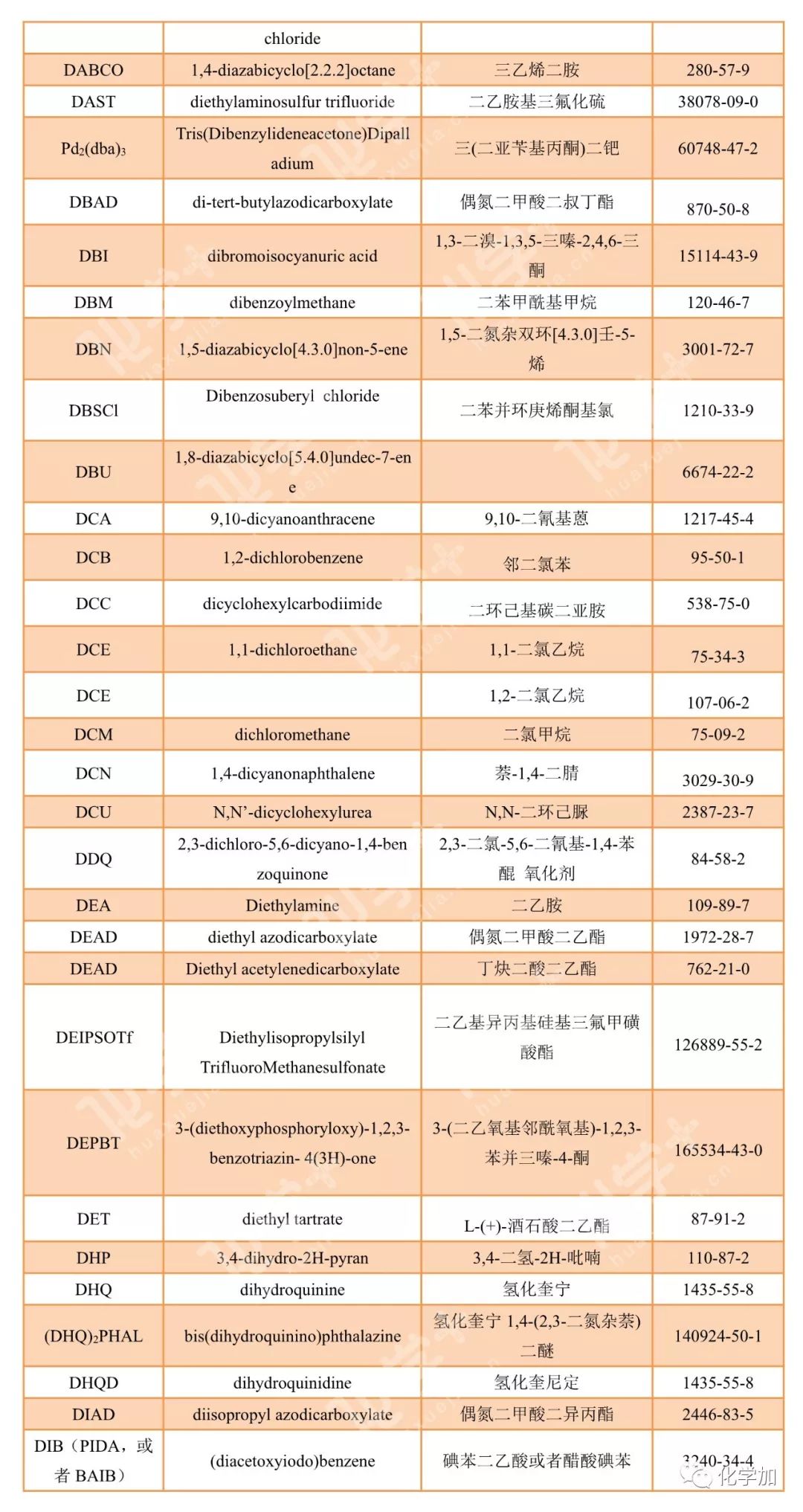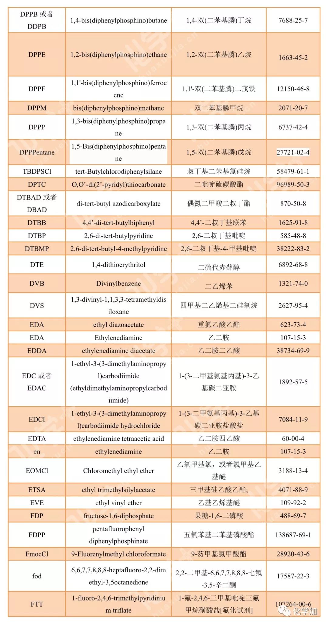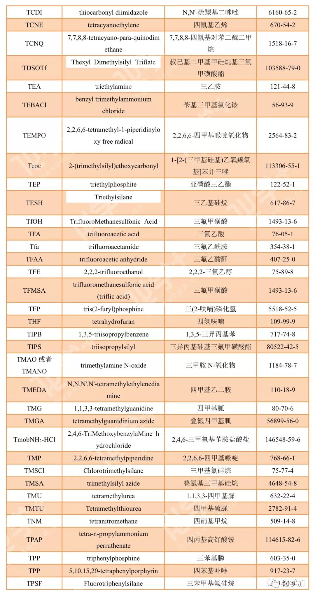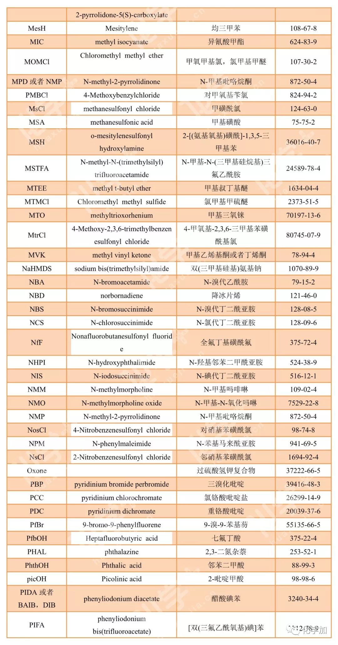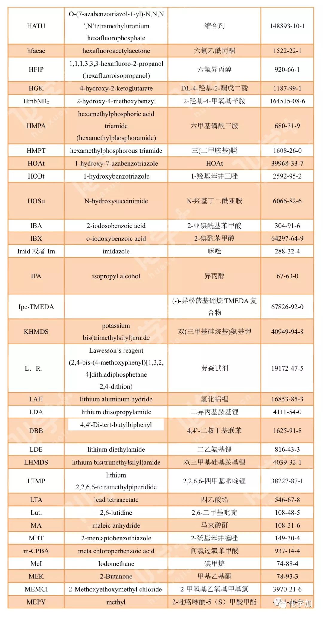 導讀:在有機化學中,我們經常遇到一些英文縮寫,大家都記得多少呢?化學加特別整理了一些縮寫,供大家參考。如發現錯誤,可留言指出。更多化學品相關信息,可點上方小程序,進入百科查詢。