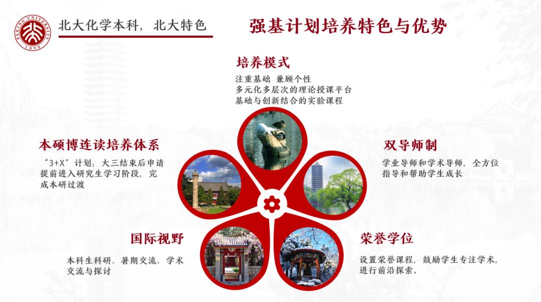 北京大學化學學院以培養基礎扎實、視野開闊、全面發展的復合型人才為目標,對強基計劃學生進行統一培養。希望通過本科階段的學習,學生具有寬厚而扎實的化學知識基礎,掌握化學認識世界的基本思路和方法,具有獲取、分析、提煉、關聯和整合信息的能力,具備自主學習能力和創新意識,具備從事科學研究的基本素養,能夠在未知的領域提出問題,并擁有跨學科解決問題的能力。