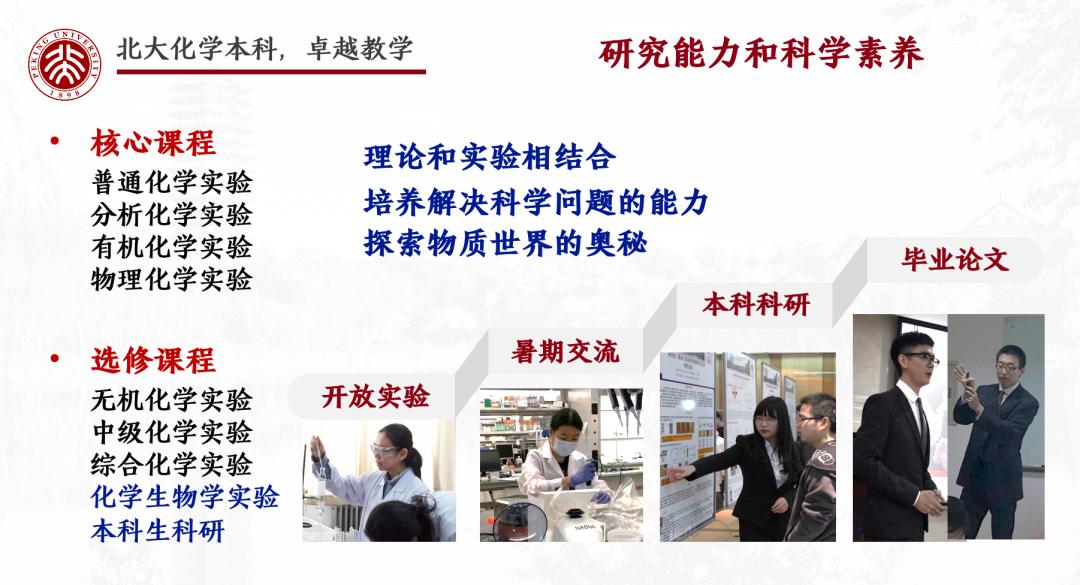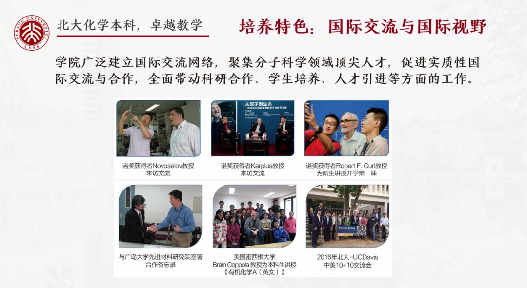 北京大學化學與分子工程學院以其優良的國際聲譽、追求卓越的教學理念和前沿的科學研究為志在化學的雛鷹們精心打造了一片翱翔的藍天。北大化學本科——未來科學家的搖籃!
