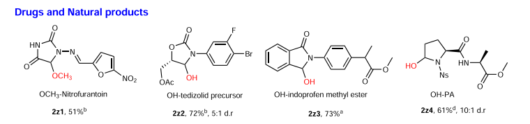 同時,作者還在氮雜環(huán)藥物及多肽修飾方面進行了簡單的嘗試,結(jié)果發(fā)現(xiàn)不論是藥物(呋喃妥因和吲哚洛芬)、藥物前體(特地唑胺)還是多肽,均可通過該方法實現(xiàn)定點修飾并且得到不錯的收率(41%-97%)。