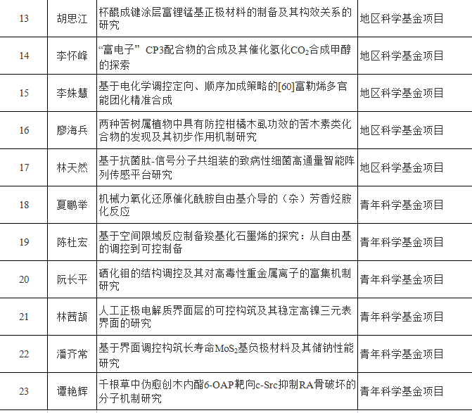導讀:2021年8月18日,國家自然科學基金委員會公布了2021年國家自然科學基金項目評審結果。廣西師范大學化學與藥學學院共獲批資助23項,占全校獲批項目總數的43.4%,其中面上項目4項(占全校面上項目立項數的57.1%),地區科學基金項目13項,青年科學基金6項,是廣西師范大學化學與藥學學院近五年以來獲得國家自然科學基金立項數最多的一年,再創歷史新高。