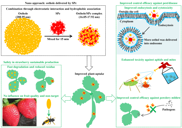 如農田應用型納米載體與蛇床子素可以通過靜電和疏水作用實現納米級裝載,二者的結合打破了蛇床子素自身的團粒結構,將其粒徑減小至17.66 nm,提升了蛇床子素對二斑葉螨、桃蚜、草莓白粉病的防效(圖6)。